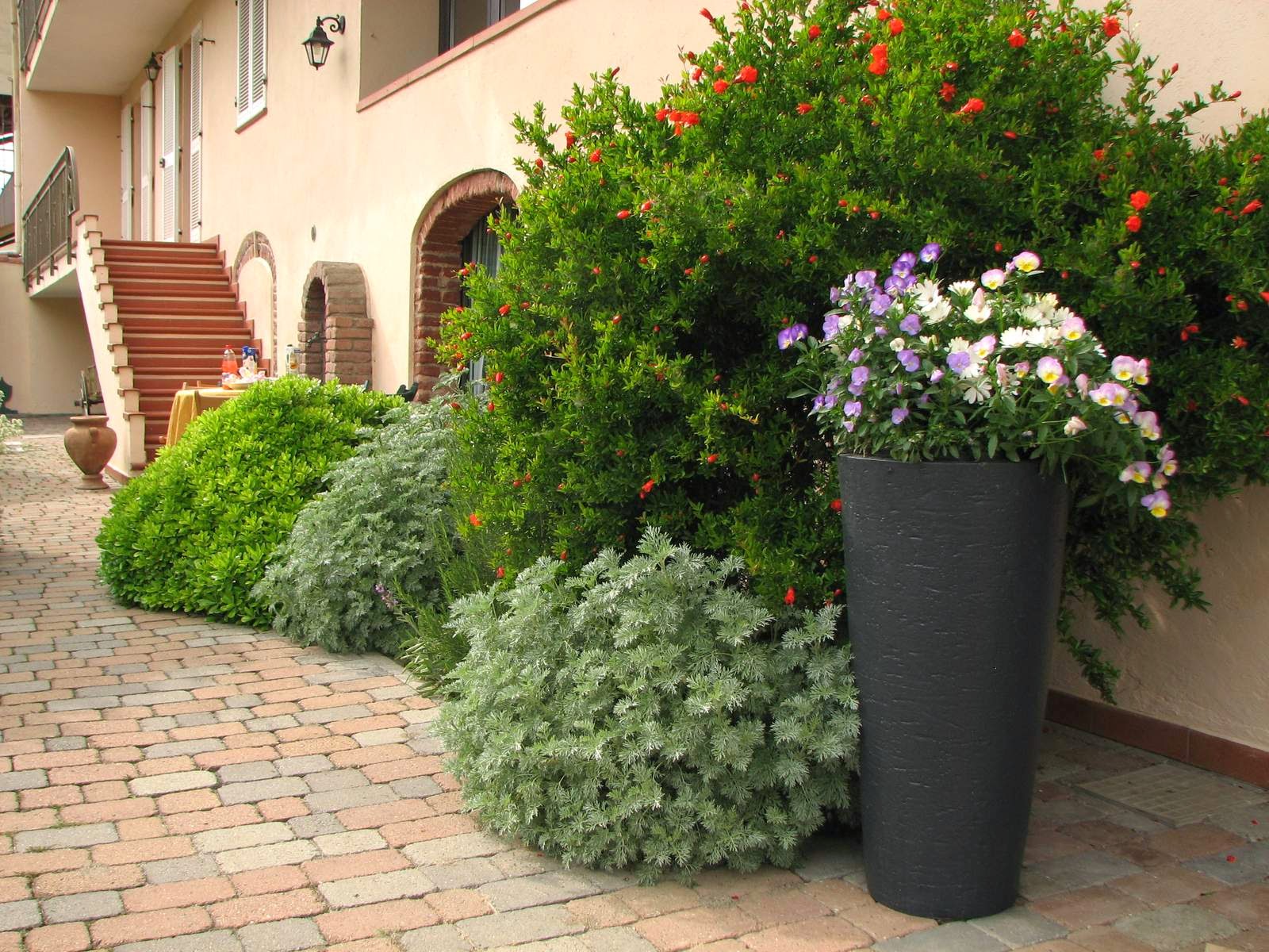 Lungo il marciapiede una bellissima bordura all'inglese in vaso